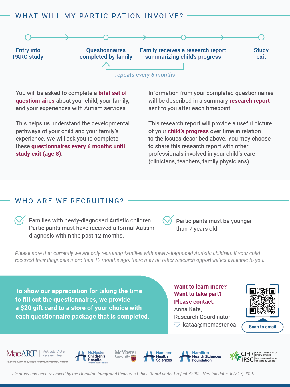 The PARC Study is a longitudinal cohort study that explores developmental trajectories in Autistic children as they are followed over time. The team aims to map developmental pathways and influences on child and family outcomes by examining various aspects such as the child’s abilities and functioning, their family life, the services they receive, and their environment. This is a multisite study in 4 provinces, following newly diagnosed Autistic children during the key early years and into entry to school. This includes children under age 7, until they turn age 8.
