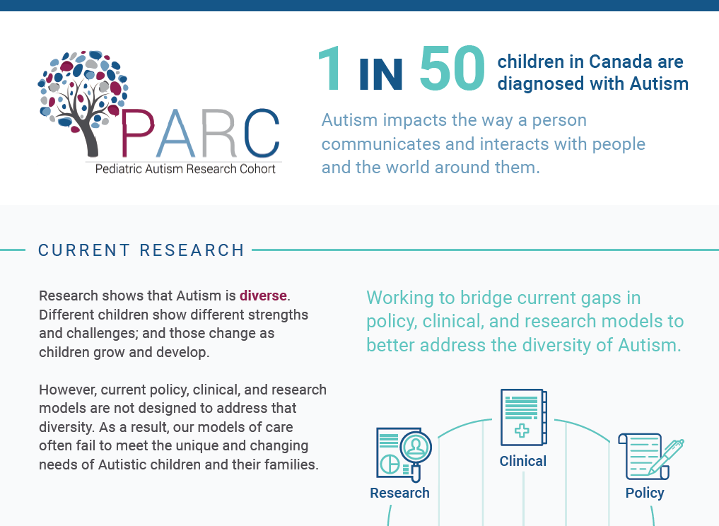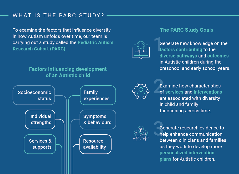 We know that autism is diverse, and different children show different strengths and challenges that change as they grow and develop. However, current policy, clinical, and research models are not well designed to address this diversity. This leads to models of care that do not optimally meet the unique and changing needs of Autistic children and their families. The PARC Study wants to address this gap and generate evidence that will improve systems of autism care and supports. The team is particularly focused on exploring how the characteristics of services and supports can impact child and family functioning over time.
